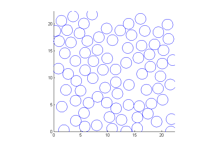3. In the command window type: mdNVE000 and then press enter. The code should run the default simulation of N=80, in a box with phi_set=.5 = 50% of the area covered by the disks, and an energy E=3. There should be an animation in the figure window. I find it useful to dock the figure window so that the command window and the figure are visible at the same time. As the code is running dots appear in the command window to indicate progress. Each dot is 10% of the simulation.